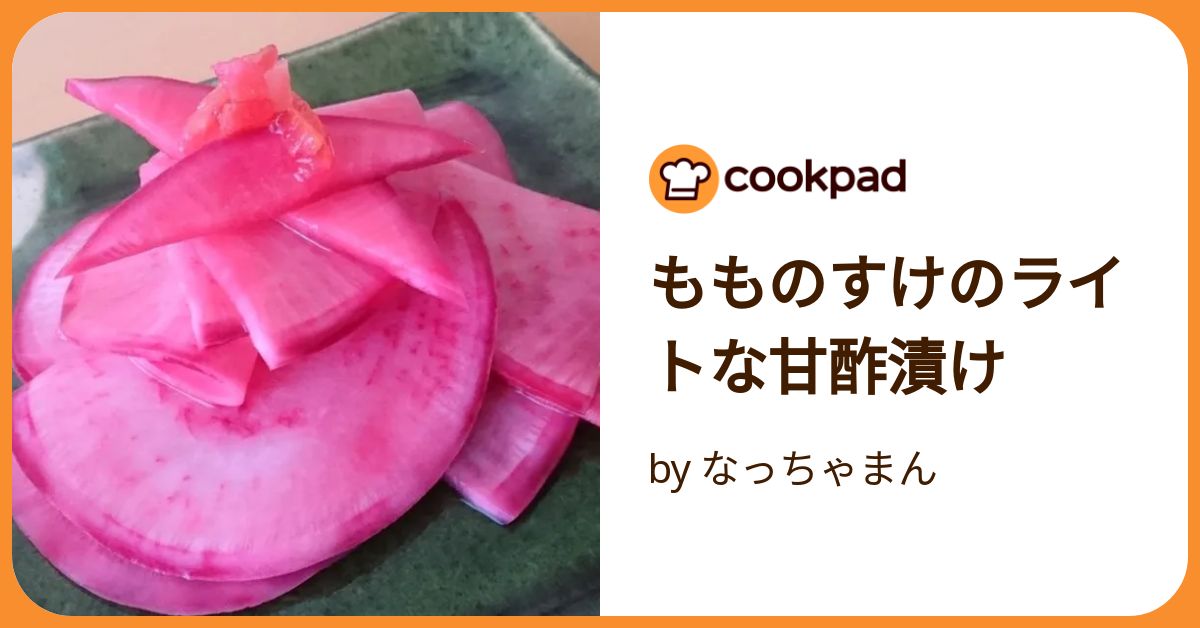 出典:cookpad もものすけのライトな甘酢漬け by なっちゃまん「もものすけのライトな甘酢漬け」の作り方。肉質柔らかで甘いかぶの「もものすけ」を使った、酸っぱすぎないサラダみたいな甘酢漬け。色も鮮やかで、お弁当にも映えますよ! 材料: もものすけ、塩、酢